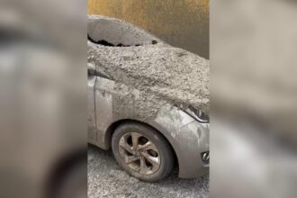 Um veículo estacionado ao lado de uma obra na 402 Norte de Brasília ficou destruído após ser atingido por cimento…