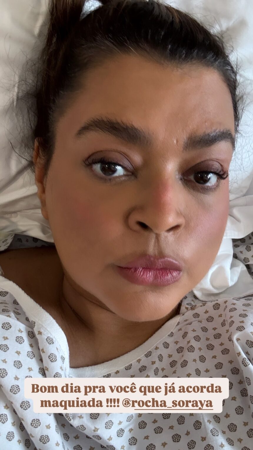 A cantora Preta Gil, 50, compartilhou uma foto maquiada na cama do hospital na manhã deste domingo (12). A publicação foi feita nos stories de seu perfil no Instagram.