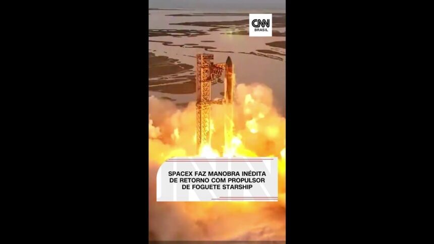 Propulsor do foguete Starship completa manobra de retorno para ser capturado por duas enormes pinças de metal presas a uma torre de lançamento após teste realizado pela SpaceX • SpaceX