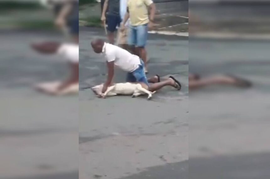 Apesar das tentativas dos moradores da região, o cão não solta o outro animal. O ataque só é interrompido quando um sargento aposentado da Polícia Militar derrubar o pit-bull, “monta nele” e lhe segura pelo pescoço.